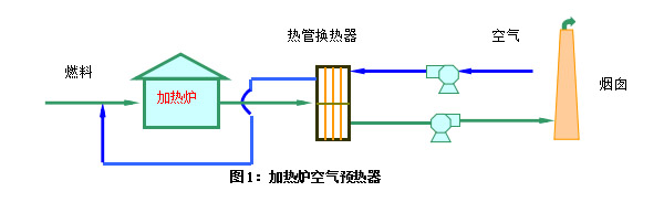 用热管换热器从工业炉的排气中回收余热以加热空气,余热后的空气返回工业炉作为助燃空气使用。流程如图1所示: