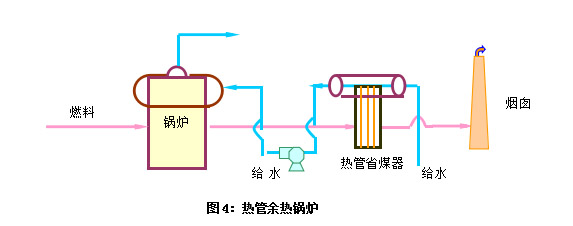 将热管换热器回收的余热用来加热水,使之成为锅炉给水,或使水产生蒸汽供其他方面使用。其流程如图3、图4所示: