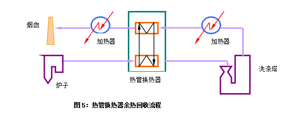 将热管换热器从排气中回收来的余热再次加热排气自身,使得经洗涤过的气体温度升高,以免腐蚀排烟设备。流程如图5所示: