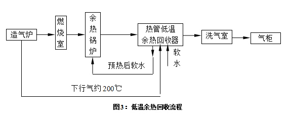 2、为充分考虑设备利用率及余热回收率,可在每一台煤造气炉后加一台热管蒸汽发生器专供上、下行煤气余热回收,而将三台煤气炉的吹风气通过一个燃烧室燃烧后进入一台热管废热锅炉,可使设备的利用率达75%~84%。