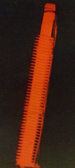 小型生产的热管裂解炉不仅吸取了管式炉结构简单、操作容易、能连续生产的优点,还使裂解温度均匀,停留时间缩短,烃的分压降低,而且可根据裂解过程前后反应所需温度不同,通过热管长短、翅片的多少方便灵活地调整温度,还可通过流体流过热管的截面大小来调整炉气的裂解停留时间。如图10所示为一小型裂解炉,热管工作温度为750~900℃,管内工作液体为金属钠。单根管的传递功率可达40KW以上。高温燃烧气直接加热热管的蒸发段,通过介质传至热管上部,使上部管壁和翅片都处于均匀的温度。